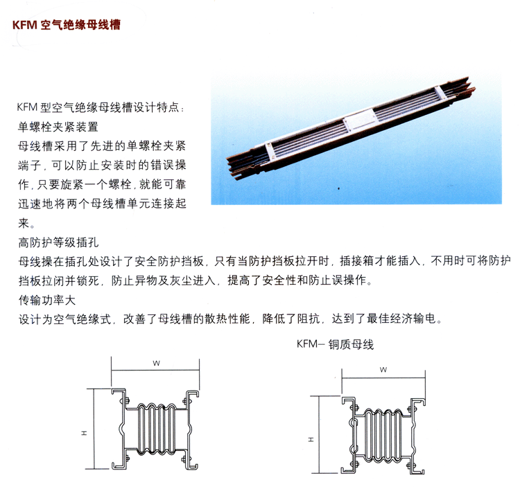 產品概述母線槽是封閉、密集、絕緣型的母線槽,插接式高強封閉母線集空氣與密集母線之優點,既能承受較強的電動力,又具較好的散熱性能,大大提高了其載荷能力。加之外殼結構設計,采用成型機成型,使其具有非凡的支撐強度,可保證連接6m母線中心沿重70公斤的壓力,跨度不超過15㎜,解決了大跨度安裝無法支撐中吊裝的困惑。廣泛應用于各行業的輸配電系統中,安裝維護方便。母線槽適用于交流三相四線,三線五線制,頻帶率50-60HZ,額定電壓至660V,額定工作電流250-5000A的供配電系統,承擔配電任務,用于低壓配電屏與大,中型負載的連接,作為大電流的輸電,用于電力變壓器與低壓配電屏以及重型負載的連接。主要應用于現代化的車間,汽車制造廠,電機制造業的電焊線,工業用電爐,廠房和高層建筑等。